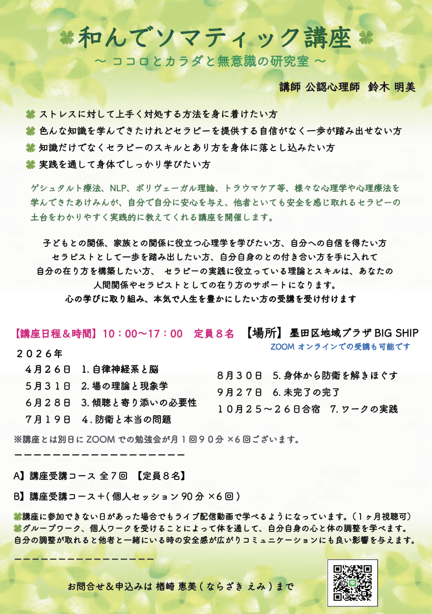 ナゴソマ講座を学び始めて今年で4年目になります。 最初の受講するきっかけは個人ワークを受けて、体の声を聴き、未完了の問題に気付き、完了の体験をすることで大きな変化があったことです。この体験をもっと学んで少しでも日常の生活に活かしていければと思いはじめました。 講座の中では身体で感じたこと、自分の想いを受け止めてくれる講師(あけみん)と仲間たちがいたからこそ、前を向いて進んでいけました。感謝です。頭で考えるのでは無く、今、身体で感じたことを大事にすることで大きな気づきに出会えます。学んだことは日常にも活かせています。